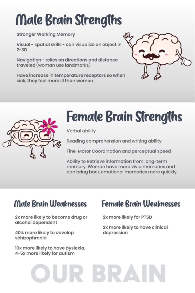 - There are more similarities than differences between male and female brains. Different parts of the brain are larger or smaller in men and women; this is where there are differences. Men tend to excel at focused projects, like maths, estimating time, judging speed, etc., while women are more likely to excel at language and multitasking. With children, women have had to multitask forever! See also ‘Male/Female Differences: Strengths and Weaknesses’ below.